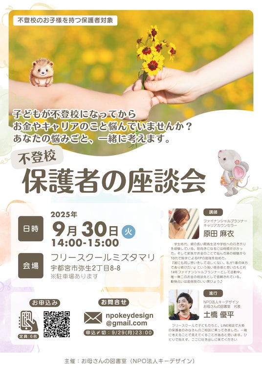 NPO法人キーデザイン(栃木県)は、2025年9月にスタートした新拠点「お母さんの図書室」にて、第1弾の講座企画として不登校の子をもつ保護者向け座談会「お金とキャリアの悩み、一緒に考えます」を2025年9月30日(火)14:00~15:00に開催します。会場はフリースクールミズタマリ2階「お母さんの図書室」(宇都宮市弥生2丁目8-8)、参加費無料・定員6名(要申込/締切9月29日[月]23:00)です。ゲストにファイナンシャルプランナーの原田麻衣さんを招き、家計や働き方の不安について、少人数で安心して話せる時間を提供します。