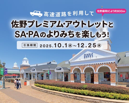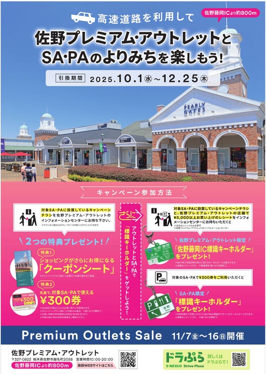 佐野プレミアム・アウトレット(所在地:栃木県佐野市 運営:三菱地所・サイモン株式会社)は、株式会社ネクスコ東日本エリアトラクトと連携し、秋の行楽シーズンから冬のホリデーシーズンにかかる10月1日(水)~12月25日(木)の期間、アウトレットと高速道路のサービスエリアおよびパーキングエリア(SA・PA)をあわせて利用すると特典が受けられる「高速道路を利用して佐野プレミアム・アウトレットとSA・PAのよりみちを楽しもう!」キャンペーンを開催します。