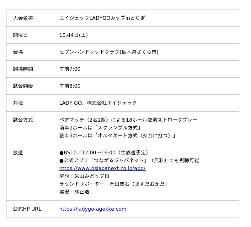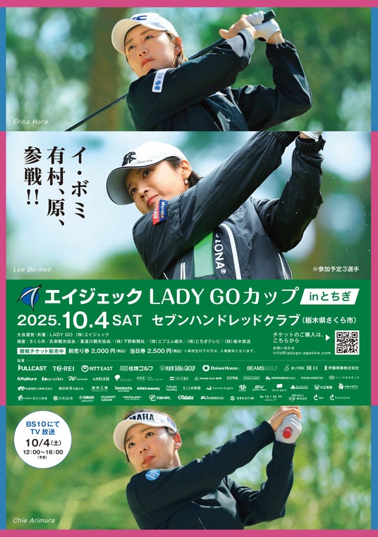 株式会社エイジェックとLADYGOが共同で主催する「エイジェックLADYGOカップinとちぎ」が、2025年10月4日(土)に栃木県さくら市のゴルフ場「セブンハンドレッドクラブ」にて、開催されることをお知らせいたします。2023年、2024年に続き今年3度目のセブンハンドレッドクラブでの開催となります。