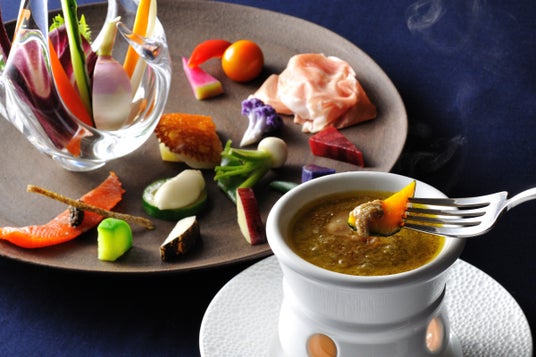 那須の恵みをふんだんに盛り込んだ一皿「農園のピンツィモーニオ」。那須に縁のある陶芸作家、小野沢 弘一(おのざわ こういち)氏が焼き上げた黒皿には、当リゾートの農園「アグリガーデン」で採れた野菜に加えて、那須で生産が盛んなチーズやヤシオマスが並び一目で恵みを感じられます。ガラスの器に盛りつけたスティック野菜は手でつまみ、収穫しているような感覚で食べられる一皿です。みずみずしい野菜を温かいバーニャカウダと組み合わせて楽しめます。