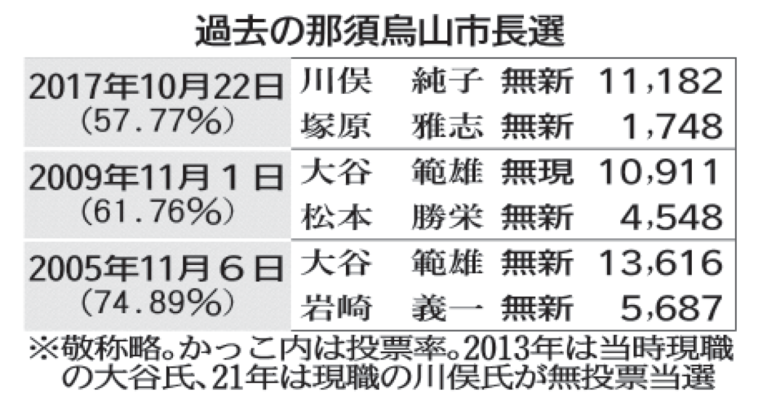 任期満了に伴う那須烏山市長選は19日の投開票まであと2日となり、終盤戦に入った。3選を目指す無所属で現職の川俣純子(かわまたじゅんこ)氏(65)=自民推薦=と無所属新人の前市議青木敏久(あおきとしひさ)氏(62)が競り合い、共に無所属新人の会社役員佐々木豊(ささきゆたか)氏(60)と団体職員小川雅幸(おがわまさゆき)氏(56)はそれぞれの戦い方で浸透を図る。4氏とも烏山地区が地盤で、南那須地区の票や現職の批判票の取り込みが鍵を握る。