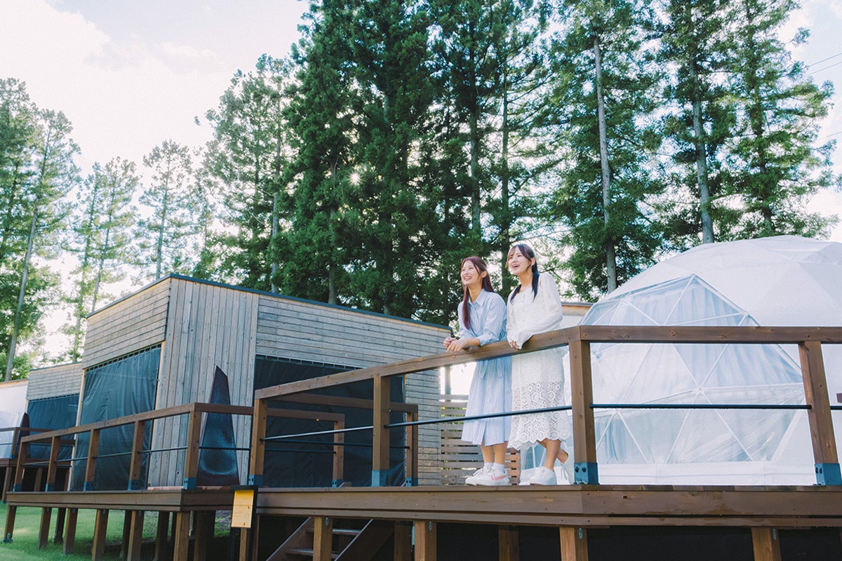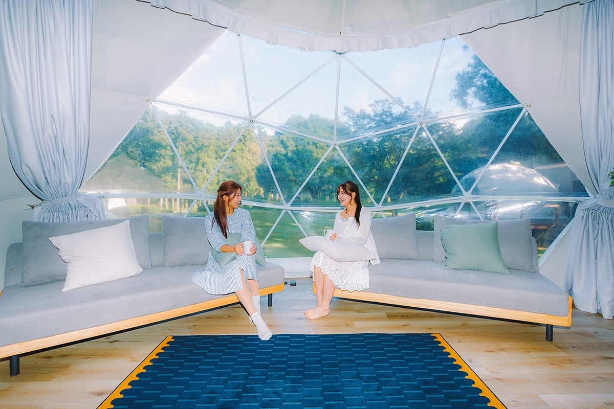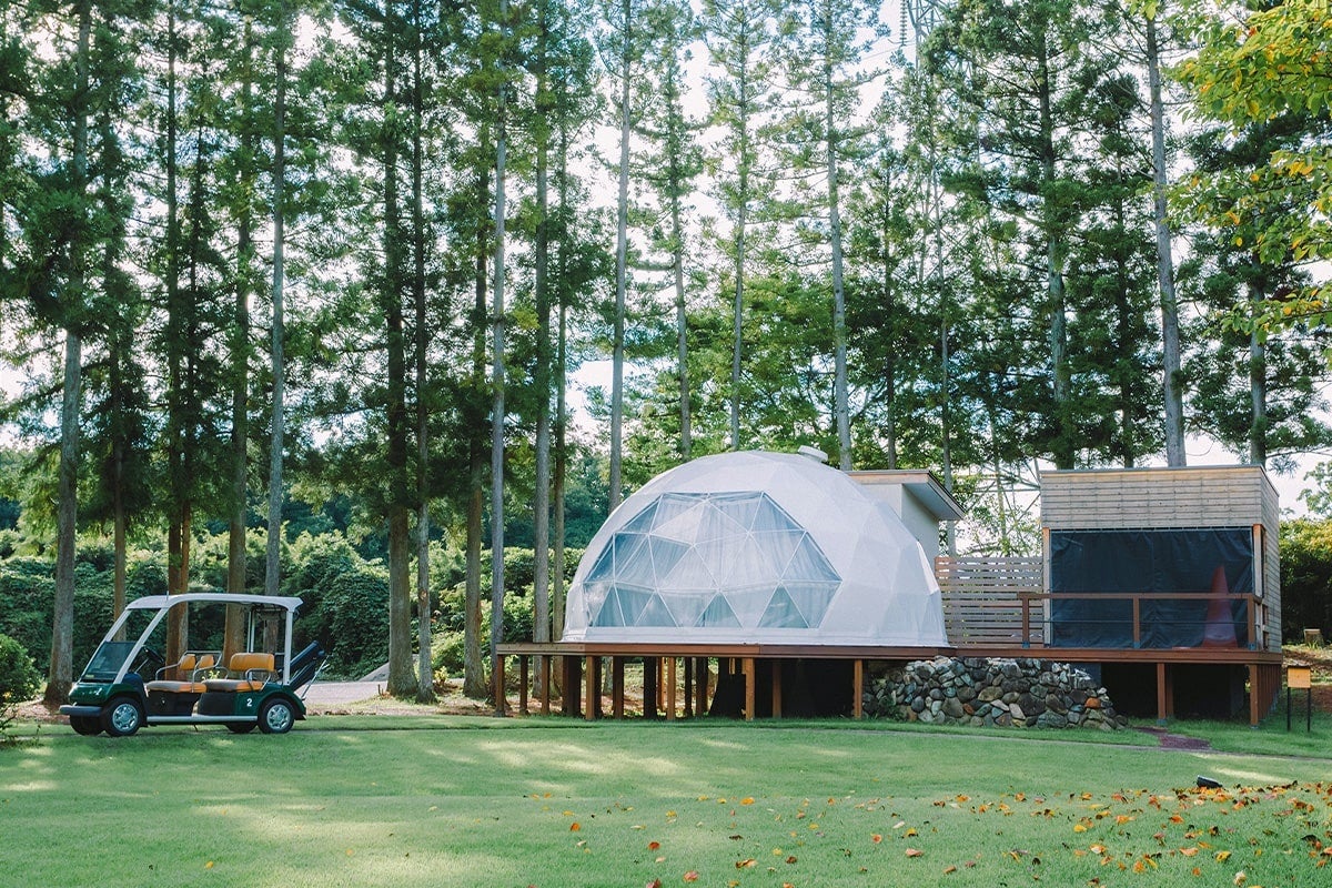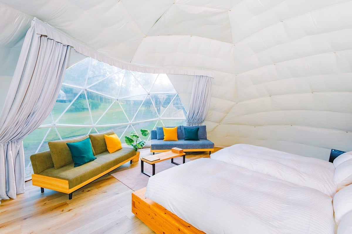 那須の雄大な自然に囲まれたグランピング施設。広々とした直径7mのドームテントには、シャワー、トイレ、洗面台、冷暖房を完備。夕食、朝食は那須の食材をふんだんに使用したお料理をご提供いたします。無料アクティビティも充実しており、非日常と贅沢な時間をお過ごしいただけます。