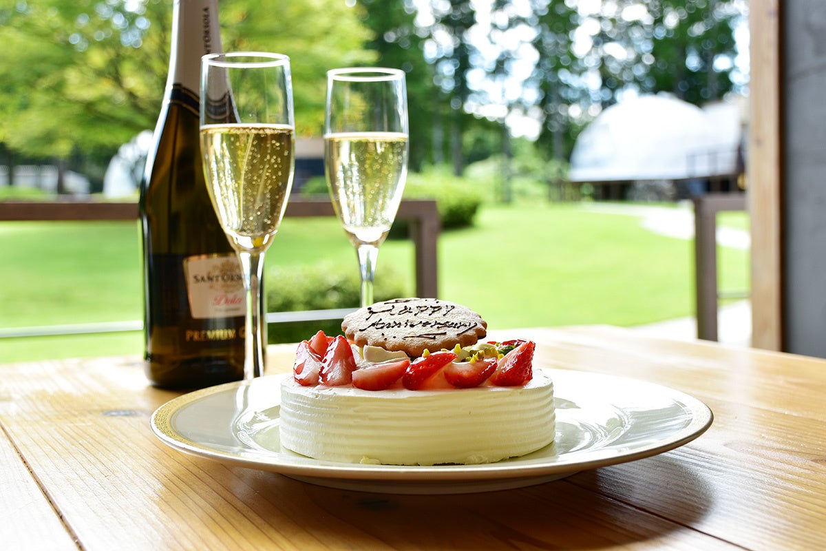 本プランでは、ご到着後にお部屋の扉を開けると、カラフルなバルーンやガーランドで彩られた華やかな空間が広がり、驚きと笑顔に包まれるサプライズをご用意。さらに、ご夕食時には、メッセージを添えたケーキをスタッフがお部屋までお届けし、二段階でのサプライズを演出いたします。お食事は、地元食材をふんだんに使用した豪華アウトドアディナーをご用意。那須の自然を感じながら焚火や澄んだ夜空とともに味わうディナーは、日常では味わえない非日常の贅沢をお楽しみいただけます。翌朝は、自然の清々しい空気に包まれながら、彩り豊かなモーニングをご提供。非日常感あふれるグランピングステイとともに、心に残る記念日を大切な方とお過ごしいただけます。