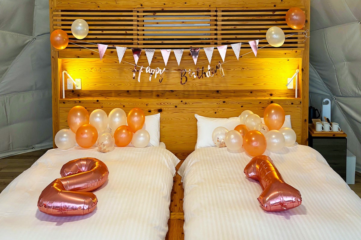 サプライズ大作戦! 誕生日や記念日をバルーンやケーキに想いを込めて素敵に演出!グランピング1泊2食付き!
