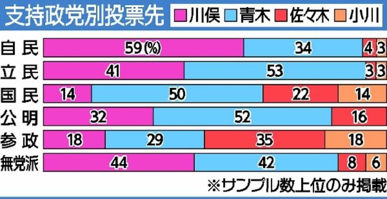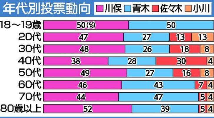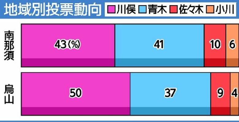 【那須烏山】現新4人による争いとなった19日投開票の市長選で、下野新聞社は出口調査を実施し、計529人から回答を得た。4人全員が烏山地区を拠点とする中、3選を果たした現職川俣純子(かわまたじゅんこ)氏(65)=自民推薦=は同地区で5割、南那須地区でも4割超えの支持を集めたことが勝利につながったとみられる。次点の前市議青木敏久(あおきとしひさ)氏(62)は元南那須町長で前市長の大谷範雄(おおやのりお)氏の支援を受けたが、南那須地区での支持は川俣氏と同程度にとどまった。