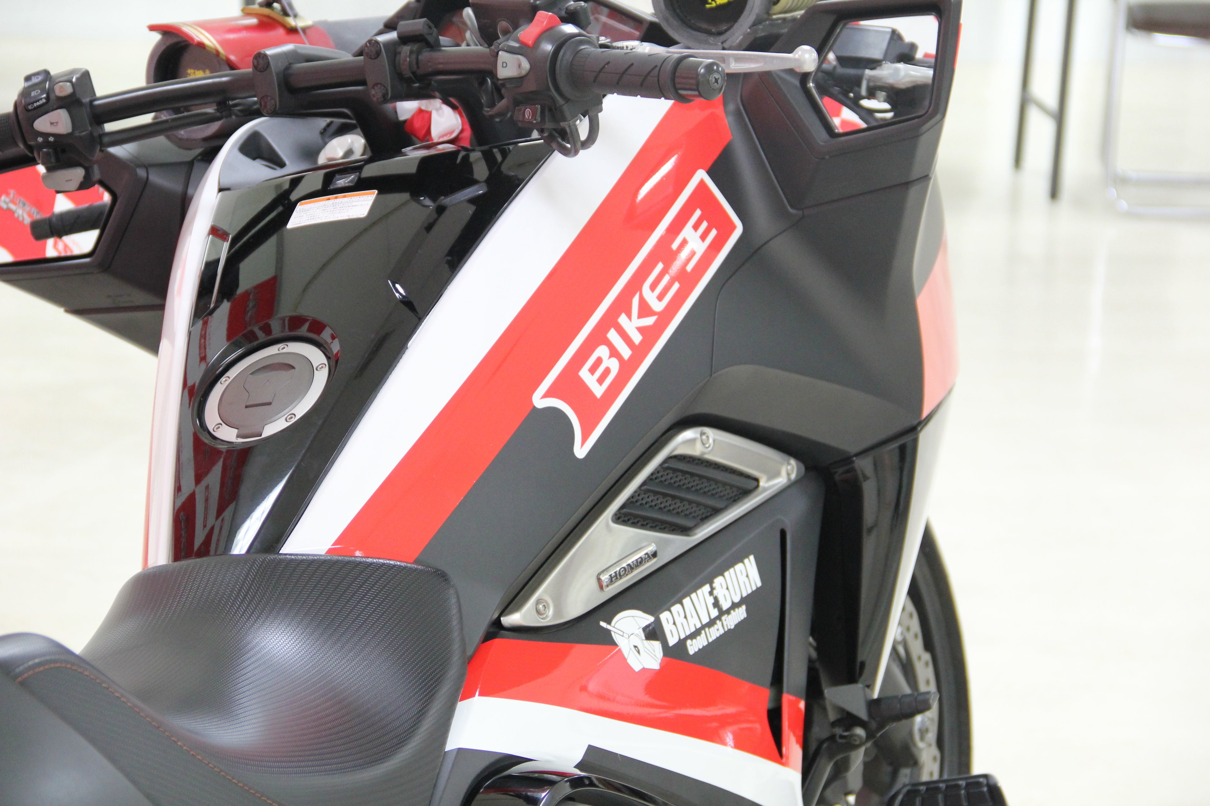 今回、当社は「開運戦士ブレイバーン」に“戦術車両”(ホンダNM4)を提供し、同時にバイク王小山店をはじめとする、各地のバイク王店舗を“活動基地”に見立て、戦術車両のメンテナンスや遠征時の支援を行いながら社会貢献活動を広げるサポートをおこなってまいります。