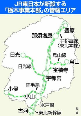 JR東日本は2026年7月に、本県などを管轄してきた大宮支社を廃止し、「栃木事業本部」を新設する。現行の運営体制を改め、本県を含む17都県の36カ所のエリアごとに事業本部を置く大規模な組織改編の一環。栃木事業本部は県内全域の路線を管轄し、路線が県をまたぐ場合は県境で区分けする。