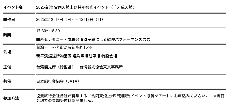 台湾観光庁は、日本旅行業協会(JATA)とのコラボにより「2025 合同天燈上げ特別観光イベント(千人放天燈)」を2025年12月7日(日)および8日(月)の2日間、台湾・十分特設会場にて開催します。