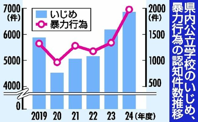 栃木県内公立の小中高校、特別支援学校で2024年度に認知したいじめの件数は前年度比11・0%(682件)増の6865件で、過去最多となったことが29日、文部科学省の問題行動・不登校調査で分かった。公立小中高校で認知した暴力行為も47・7%(639件)増の1978件と、過去最多となった。県教委は「重大事態になるのを防ぐため早期対応を積極的に進めており、いじめと暴力行為の認知が増加している」と分析している。