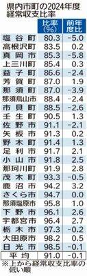 県総合政策部は5日、県内25市町の2024年度普通会計決算(一般会計と、公営事業会計を除く特別会計の合算)を発表した。財政の硬直化を示す「経常収支比率」は市町平均で91・0%で、統計が残る1975年度以降で最悪だった前年度から0・1ポイント改善したものの、物価高や職員給与引き上げの影響で財政の自由度が狭まっている現状が浮き彫りになった。
