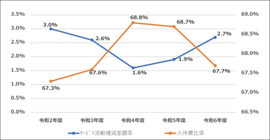 全法人の過去5年分の推移をみると、サービス活動増減差額率は令和4年度以降上昇傾向にあり、令和6年度には2.7%となりました。昨今の経営環境の悪化による落ち込みから、業績は緩やかながら回復基調にあるといえます。