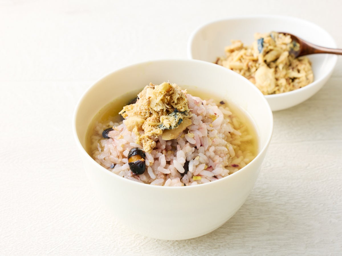 雑穀米に鯖フレークとブイヨンスープをかけると朝のからだにやさしいアレンジメニューに!