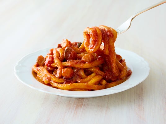 もっちりとしたうどんに、トマトの風味豊かなソースを絡めたやさしい味わい