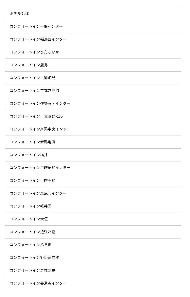 対象ホテル名 : コンフォートイン 28ホテル(※コンフォートイン東京六本木、コンフォートイン名古屋栄駅前、コンフォートイン京都四条烏丸、コンフォートイン福岡天神、コンフォートイン那覇泊港を除く)