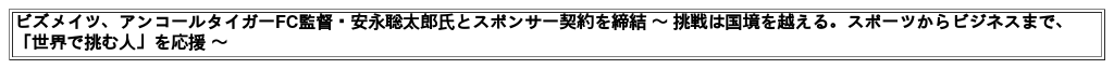 ビジネス特化型オンライン英会話サービス「Bizmates(ビズメイツ)」を提供するビズメイツ株式会社(本社:東京都千代田区、代表取締役社長:鈴木伸明、以下「当社」)は、カンボジア・シェムリアップを拠点に活動するプロサッカークラブ「アンコールタイガーFC」の監督であり、元Jリーガーとしても知られる安永聡太郎氏とスポンサー契約を締結しました。