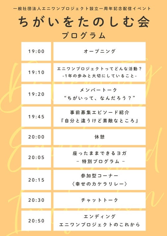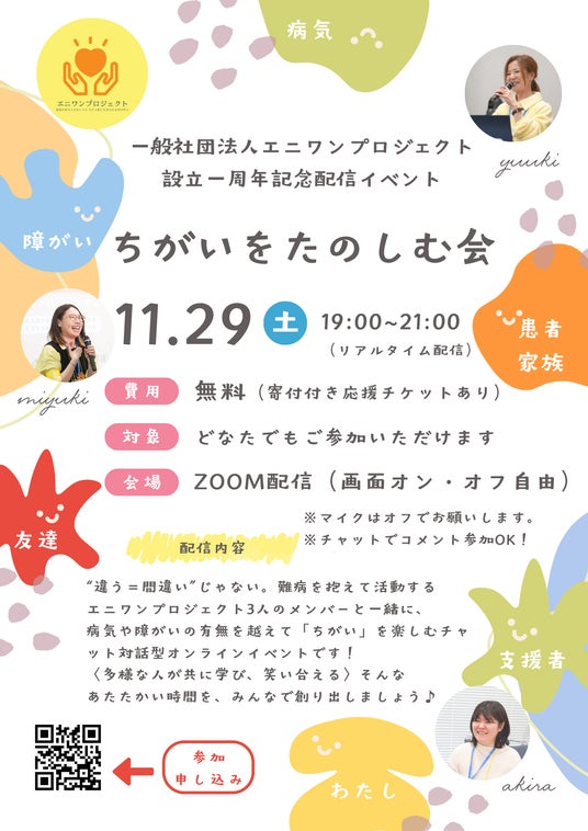 一般社団法人エニワンプロジェクト(本社:東京都練馬区、代表理事:狐崎友希)は、11月29日(土)19:00より一般社団法人設立1周年記念イベント【ちがいをたのしむ会】をZOOM配信にて開催いたします。