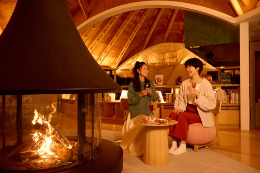 暖炉の灯る空間でくつろぎのひとときを過ごす
