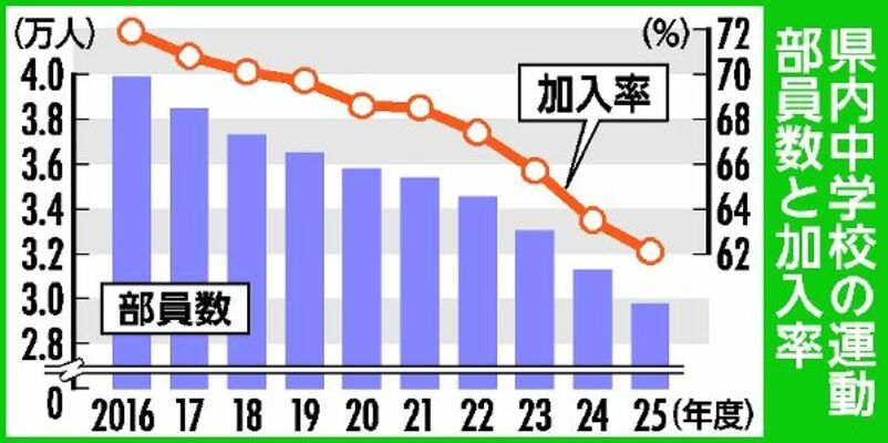 栃木県内中学生の2025年度の運動部加入率は前年度比1・4ポイント減の62・1%となり、過去最低を更新したことが16日までに、県教委のまとめで分かった。減少は12年連続減。部活動に加入せず地域スポーツクラブなどで活動する割合は1・4ポイント増の8・9%と年々増加しており、県教委は「地域クラブなど部活動以外の選択肢が増えている」と分析している。一方、全日制高校の運動部加入率は1・2ポイント増の45・8%で過去最高となった。