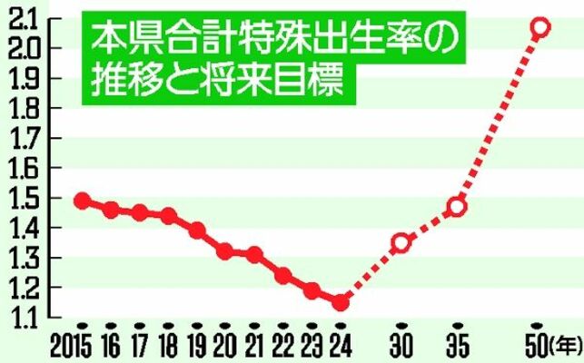 栃木県は17日の県議会次期プラン検討会で、次期重点戦略(2026~30年度)の成果指標として、30年までに女性1人が生涯に産む子どもの推定人数「合計特殊出生率」を1.35まで引き上げる案を示した。同プランで掲げる60年の県人口約140万人確保に向け、過去最低を更新した24年の1.15から0.20ポイントの上昇を中間目標として位置付ける。妊娠・出産・子育ての各段階に応じた切れ目ない支援を充実させ、目標の達成を目指す。