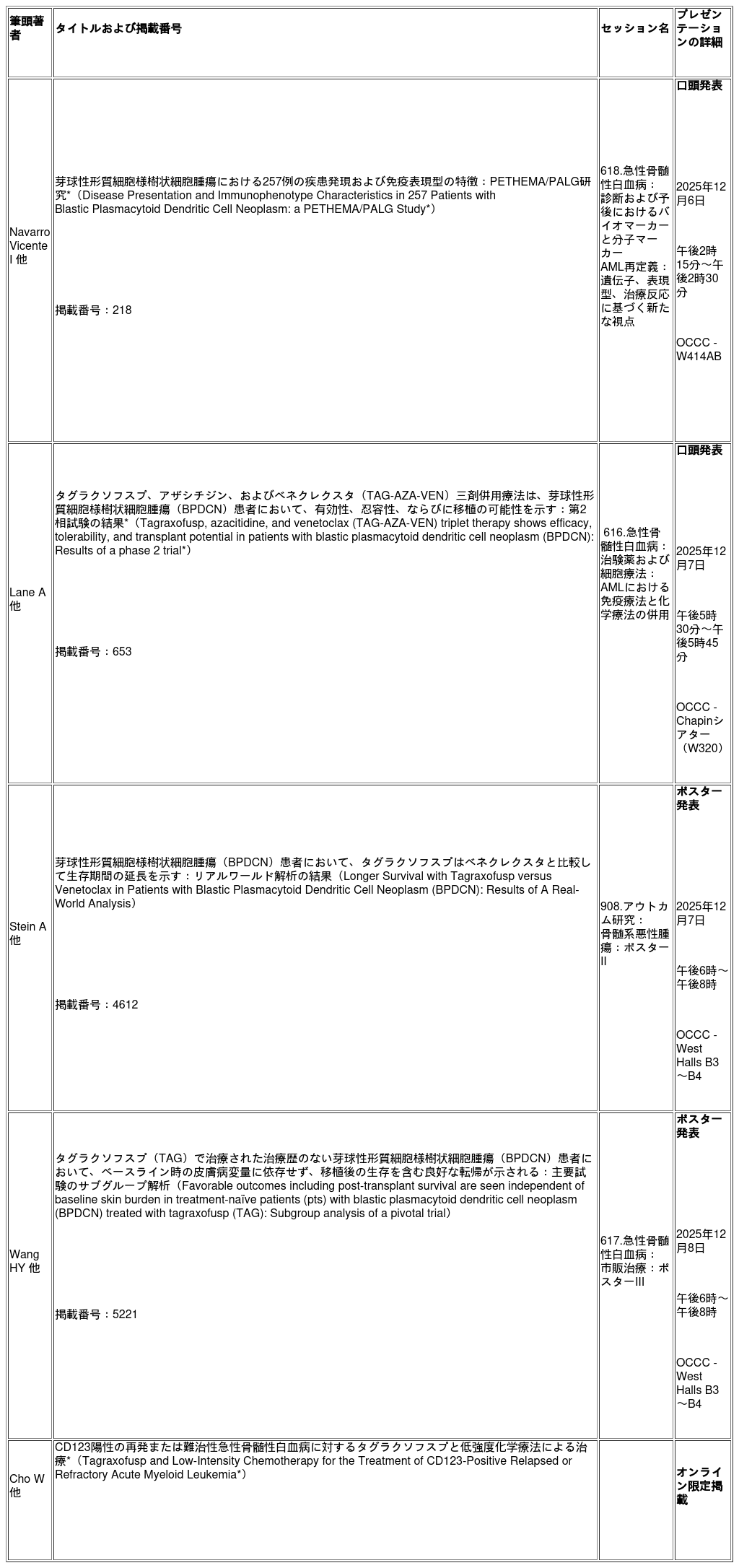 発表には、タグラクソフスプ、アザシチジン、およびベネクレクスタを組み合わせた三剤併用療法に関する結果を強調した口頭発表セッションが含まれています。この療法は、芽球性形質細胞様樹状細胞腫瘍(BPDCN)の患者において、有効性(高い奏効率と移植への橋渡し率)と忍容性の両方を示すものです。