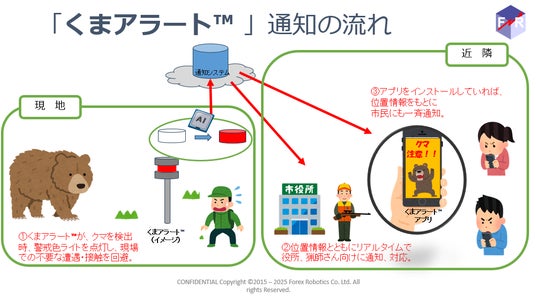 アーバンベア向け防衛システム「くまアラート(TM)」を発表。AIによる監視、警告、一斉通知をリアルタイムに行うことにより、市街地に出没するアーバンベアへの初動防衛対策に。