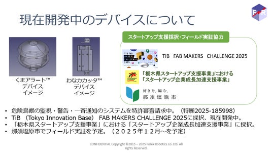 開発・支援状況 現在、TiB (Tokyo Innovation Base) 様栃木県様のご指導・ご支援をいただき、「くまアラート(TM)」および、スマート罠デバイス「わなカカッタ(TM)」の開発をしており、那須塩原市様のご協力で12月からフィールド実証を実施予定です。