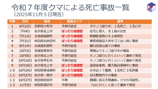 2025年は統計史上最悪のクマの被害数になりました。すでに今年のクマによる死亡事故は11月時点で13名に上り、弊社で被害ケースを精査したところ半数が市街地での「アーバンベア」による「ばったり遭遇型」事故でした。