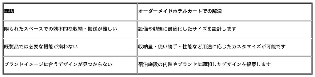宿泊業界では 業務の効率化と付加価値の向上が求められ、備品や設備においても機能性とデザイン性を両立した製品がほしいというニーズが高まっています。特に、以下のような課題を抱える施設において、オーダーメイドホテルカートの導入は大きなメリットをもたらします。