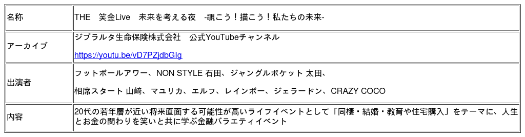 ジブラルタ生命保険株式会社(本社:東京都千代田区、代表取締役社長 兼 CEO:蕪木 広義、以下「ジブラルタ生命」)と吉本興業株式会社(本社:大阪市中央区、代表取締役社長:岡本 昭彦、以下「吉本興業」)は、2024年4月より金融教育分野で協業を開始した「すまいるマネープロジェクト(略称:わらきん)」の一環として、若年層の金融リテラシー向上を目的に、2025年11月7日(金)に、金融バラエティイベント「THE 笑金Live 未来を考える夜 -覗こう!描こう!私たちの未来-」を開催しました。大いに盛り上がった同イベントのアーカイブ映像を本日より、ジブラルタ生命保険株式会社公式YouTubeチャンネルにて公開します。