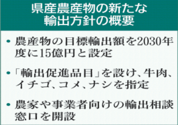 福田富一(ふくだとみかず)知事は28日の県議会代表質問で、県産農産物の目標輸出額を2030年度に15億円とする考えを明らかにした。現行の本年度の目標額は10億円としており、5年後に50%引き上げる。牛肉は台湾、イチゴは米国や欧州での販路拡大を目指す。新たに「輸出促進品目」を定めてプロモーションを強化する他、地域ごとに農家や事業者向けの相談窓口を設け、輸出促進を図る。12月に策定予定の県産農産物の新たな輸出方針に盛り込む。