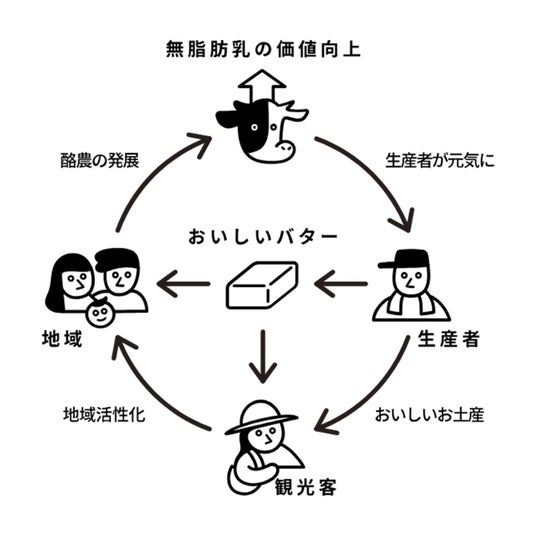 酪農家がバターを作る際に、牛乳から約4%しかバターが取れない一方で、残りの90%以上はスキムミルク(無脂肪乳)として安価に取引されたり、活用方法が見出せない現状がありました。そのスキムミルクに新たな価値を見出し、美味しいお菓子として生まれ変わらせ、また、雇用を生み出すことで地域活性化にも繋げることを目指し、「バターのいとこ」が誕生しました。