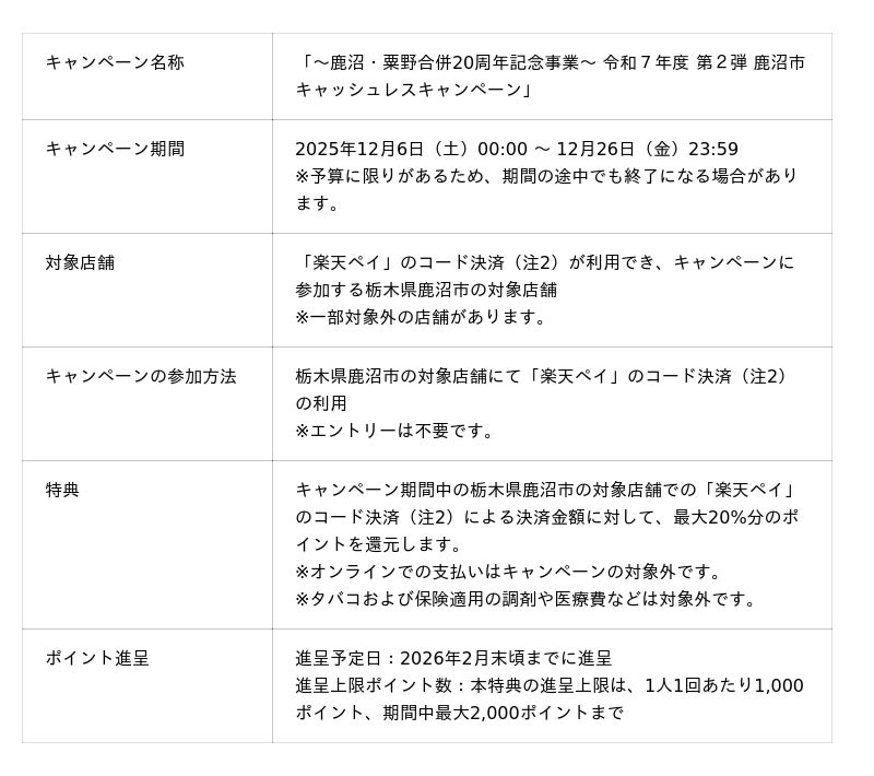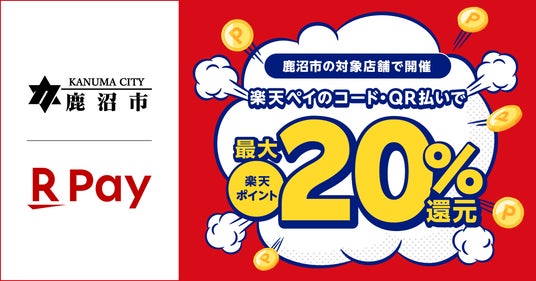 楽天ペイメント株式会社(以下「楽天ペイメント」)は、運営するキャッシュレス決済サービス「楽天ペイ」において、栃木県鹿沼市の鹿沼市キャッシュレスキャンペーン実行委員会が2025年12月6日(土)から12月26日(金)まで実施する「~鹿沼・粟野合併20周年記念事業~ 令和7年度 第2弾 鹿沼市キャッシュレスキャンペーン」に参加することをお知らせします。
