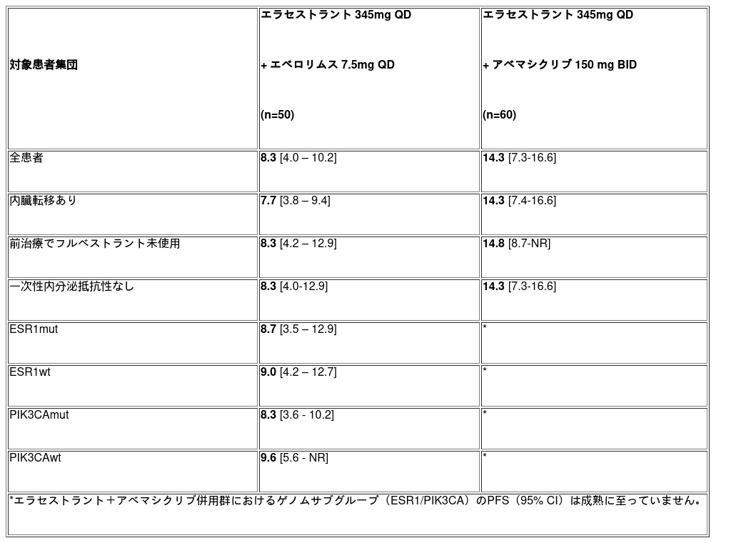 SABCSで発表されるELEVATE試験のデータは、ER+/HER2-の転移性乳がん(mBC)患者において、ESR1変異の有無にかかわらず、内分泌療法(ET)施行後(CDK4/6阻害剤の前治療歴の有無を問わず)に病勢進行を認めた患者に対し、エラセストラントとエベロリムス、またはアベマシクリブとの併用が一貫したPFSベネフィットを示していることを示しています。これらの最新結果は、各種分子標的治療薬と標準的内分泌療法を併用した際の既知の安全性プロファイルと一致しており、併用療法における安全性が確認されていることも示しています。