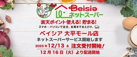 株式会社ベイシア(本社:群馬県前橋市、代表取締役社長:相木孝仁)は、楽天グループ株式会社(以下「楽天」)が提供するネットスーパーのプラットフォーム「楽天全国スーパー」内に出店する「ベイシアネットスーパー」において、ベイシア大平モール店からの配送を2025年12月16日(火)より開始いたします。