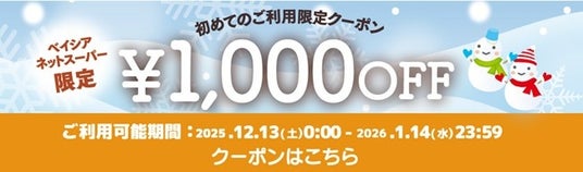 「ベイシアネットスーパー」で初めてお買い物をされるお客様限定で、1,000円OFFクーポンをプレゼントいたします。