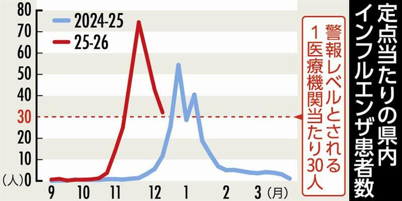 栃木県は18日、県内の1医療機関当たりのインフルエンザ患者数(8~14日)が32・19人だったと発表した。3週連続で減少したが、警報レベル(30人)は依然として超えている。