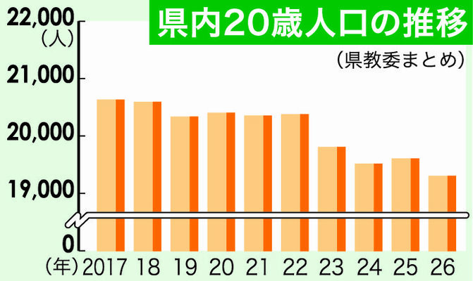 2026年1月に県内各市町が主催する20歳を祝う式典への参加対象者が、前年比302人減の1万9298人で過去最少となることが18日までに、県教委のまとめで分かった。ピーク時(1994年、3万5177人)から減少が続き、少子化の影響が顕著となっている。