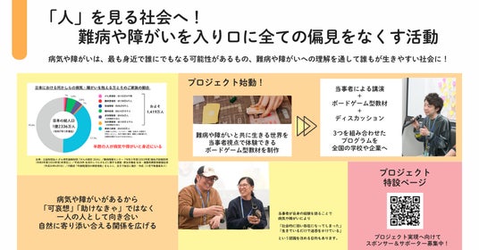毎月開催している交流会の継続、そして「OTAGAISAMA(お互いさま)」と「ON-OKURI(恩送り)」の輪を広げるため、難病や障がいを疑似体験できるボードゲームを活用したプログラムを全国に広げるプロジェクト【「人」を見る社会へ!難病や障がいを入り口に全ての偏見をなくす活動】を実施すると宣言。