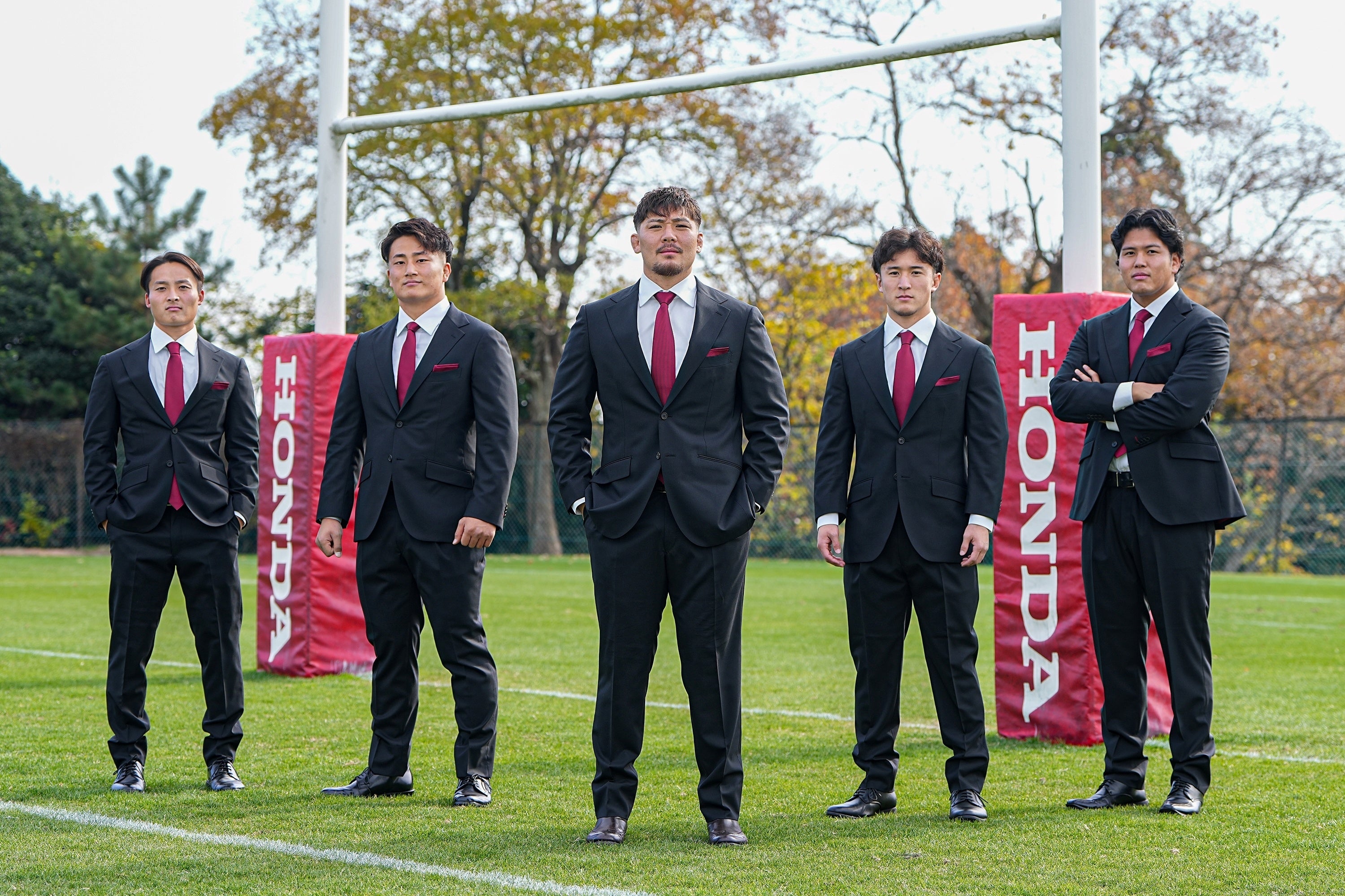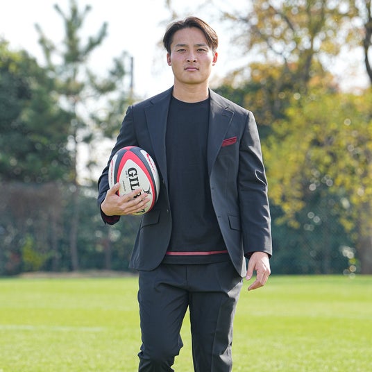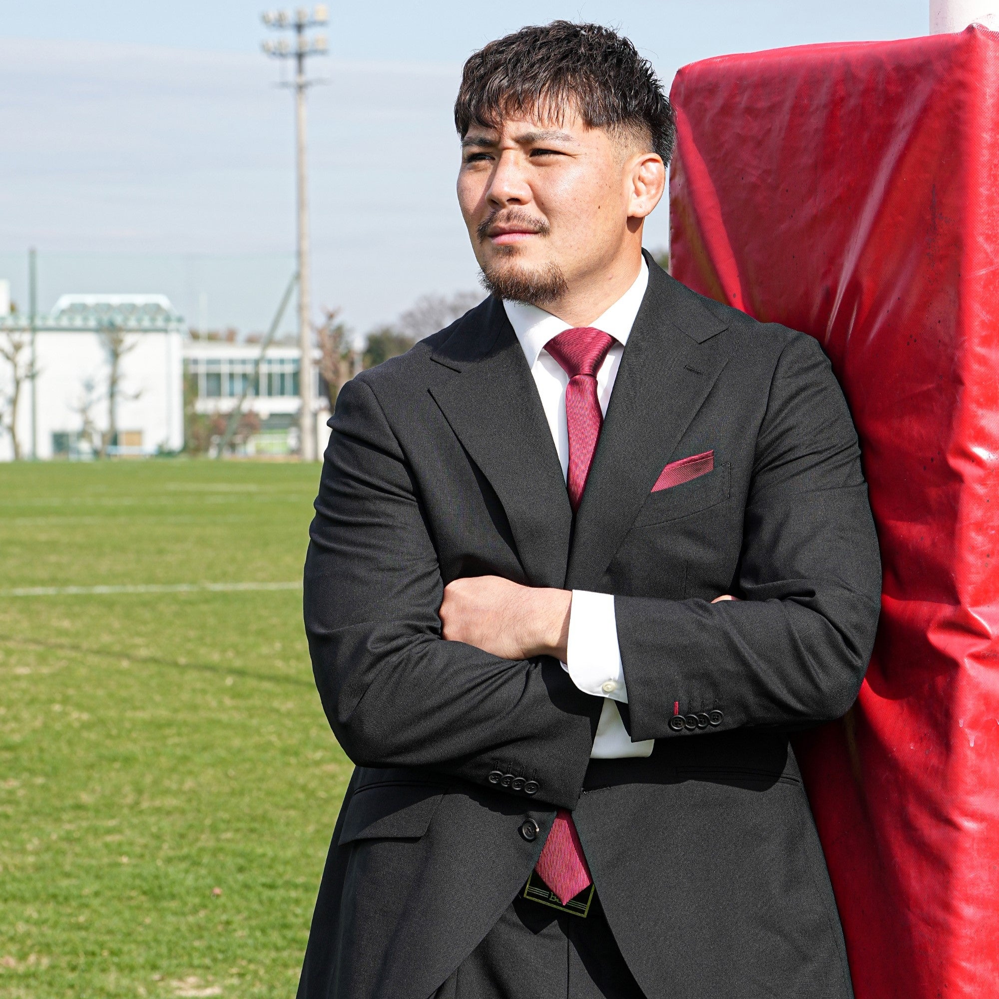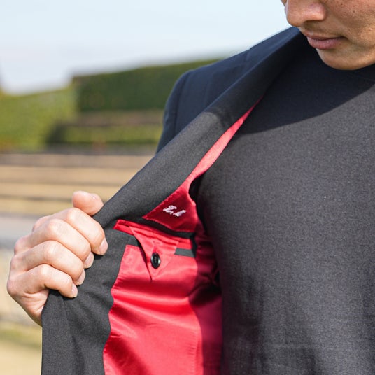 メインカラーには、風格と品性を感じさせる「墨黒」を採用。ネクタイにはソリッドでクールな赤を使用し、同色のチーフで華やかさを添えました。さらに、ジャケットの裏地や衿裏など、見えない部分にも赤をあしらうことで、チームカラーである黒と赤を真摯に表現しています。