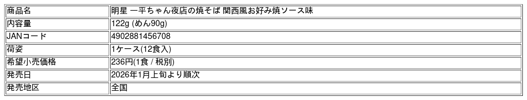 明星食品株式会社 (社長:豊留昭浩) は、カップ焼そば「明星 一平ちゃん夜店の焼そば 関西風お好み焼ソース味」「(同) やみつき塩だれ味」「(同) 醤油バター明太子味」を、2026年1月上旬から全国で順次リニューアル発売します。