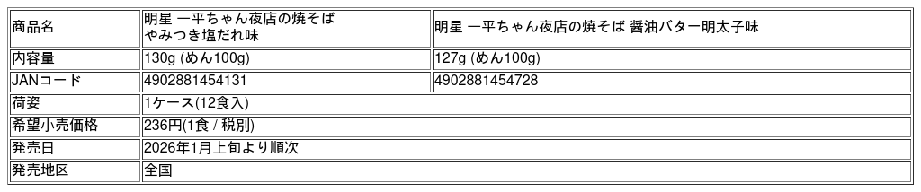 「明星 一平ちゃん夜店の焼そば 関西風お好み焼ソース味」「(同) やみつき塩だれ味」「(同) 醤油バター明太子味」を2026年1月上旬より順次リニューアル発売