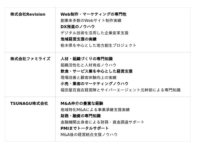 30代の経営者3名がそれぞれの専門性を持ち寄り、単発の施策ではなく、承継から再成長までを一気通貫で支援することを目的としています。