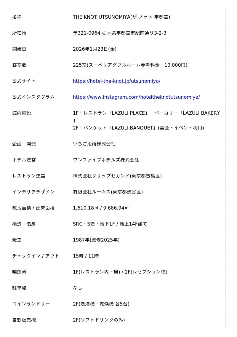 ワンファイブホテルズ株式会社(本社:福岡県福岡市、代表取締役会長兼社長:石原実)は、ライフスタイルホテル「THE KNOT UTSUNOMIYA(ザ ノット 宇都宮)」を、2026年1月23日(金)、JR宇都宮駅西口徒歩1分の地に開業いたします。