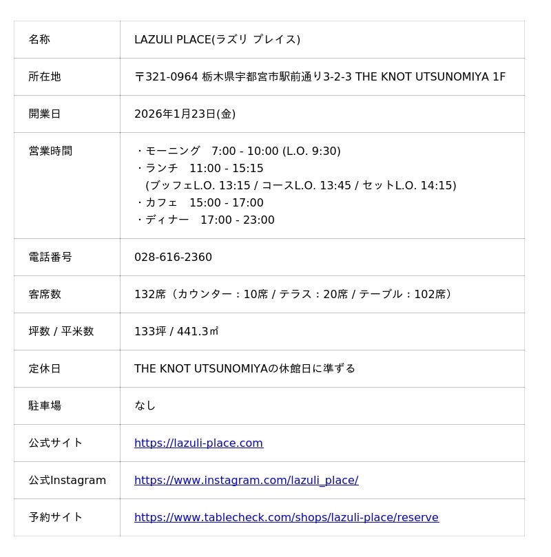 LAZULI PLACEは、THE KNOT UTSUNOMIYAの1Fに位置する朝7:00から夜23:00まで一日を通して利用できるオールデイレストランです。全国から届く旬の食材に、栃木の恵みを織り交ぜながら、宿泊者はもちろん、街の人々にもひらかれた「街のリビング」として、日常と非日常が交わる時間を提供します。