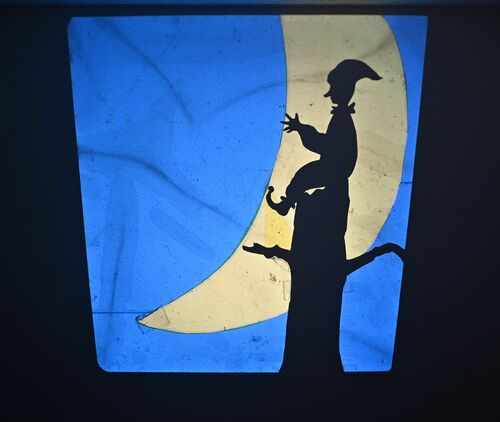 森の中を歩いていたワンワンちゃんが、高い木のてっぺんに男が腰を掛け、お月さまを磨いているのを見かける不思議な話です。男が片手でお月さまを捕まえて「もっと光れ、もっと光れ」と磨くと、光のかすがこぼれます。