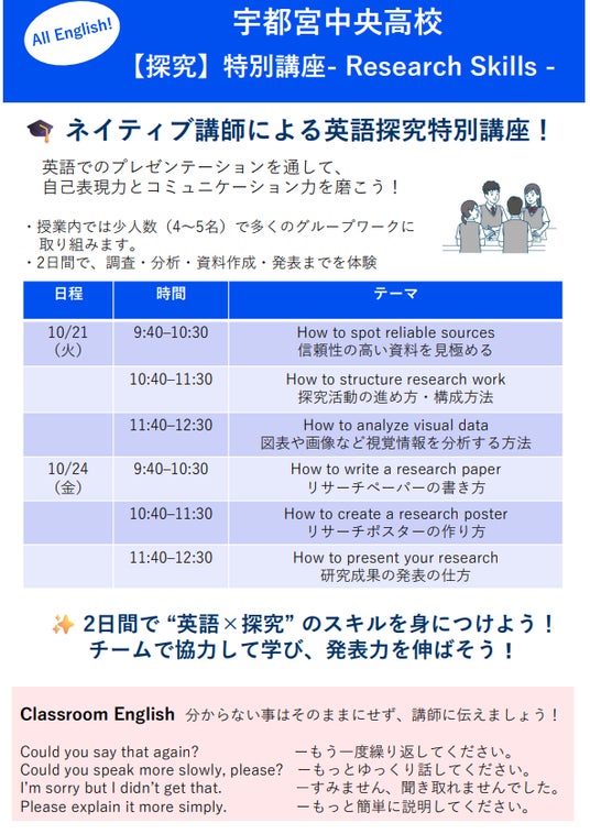 ベルリッツ・ジャパン株式会社(本社:東京新宿区 代表取締役社長:ギャンブル ポール ウィリアム)は、栃木県が委託する令和7年度「とちぎグローバルゲートウェイ事業」において、10月に研究指定校である県立宇都宮中央高等学校にて探究特別講座を開催いたしました。
