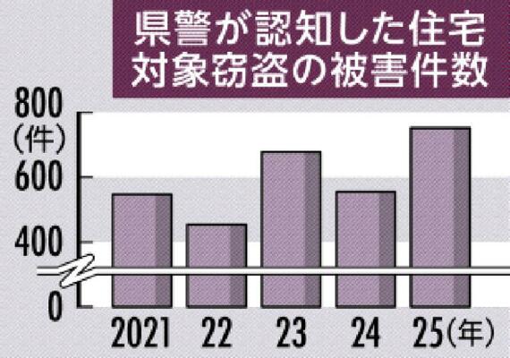 県警が2025年に認知した住宅を狙った窃盗の被害件数は前年比約35%増の752件(暫定値)で、過去5年で最も多いことが16日までに分かった。県警によると新型コロナウイルス禍前の水準に戻ってきており、被害が減少した間に防犯意識が低下した可能性を指摘する。無施錠の窓や玄関からの侵入や、ガラスを割り、解錠して侵入する方法が大半を占めるという。一方、二重ガラスなどで窃盗犯の侵入を防いだケースもあり、県警は警戒や防犯グッズの活用を呼びかける。