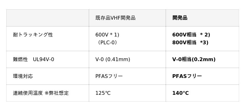 本開発品は、PFASフリー、ノンハロゲン難燃処方により環境配慮に対応しながら、耐熱性を高め業界最薄クラスの厚さ0.2mmで耐トラッキング性(800V対応)を実現しました。より厳しい高温・高電圧環境での使用を可能にします。今後はサンプル提供を通じた顧客評価と市場展開を計画しています。