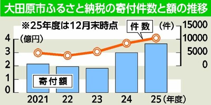 大田原市は20日までに、2025年度の市へのふるさと納税寄付額が昨年12月末時点で3億6千万円を超え、2年連続で過去最高を更新したと明らかにした。コメの小売価格が高止まりする中、返礼品にコメを選ぶ寄付の額が前年同時期に比べ3倍以上になったという。資生堂が市内の那須工場で生産する美白美容液も人気で数字を押し上げた。市は25年度の寄付額が最終的に4億円程度になると見込んでいる。