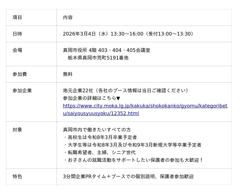栃木県真岡市では、地域に根ざした雇用拡大を目的に、「もおか市合同企業説明会」を2026年3月4日(水)に開催します。地元企業22社が集結し、人事担当者と直接話せる「対話型の説明会」です。